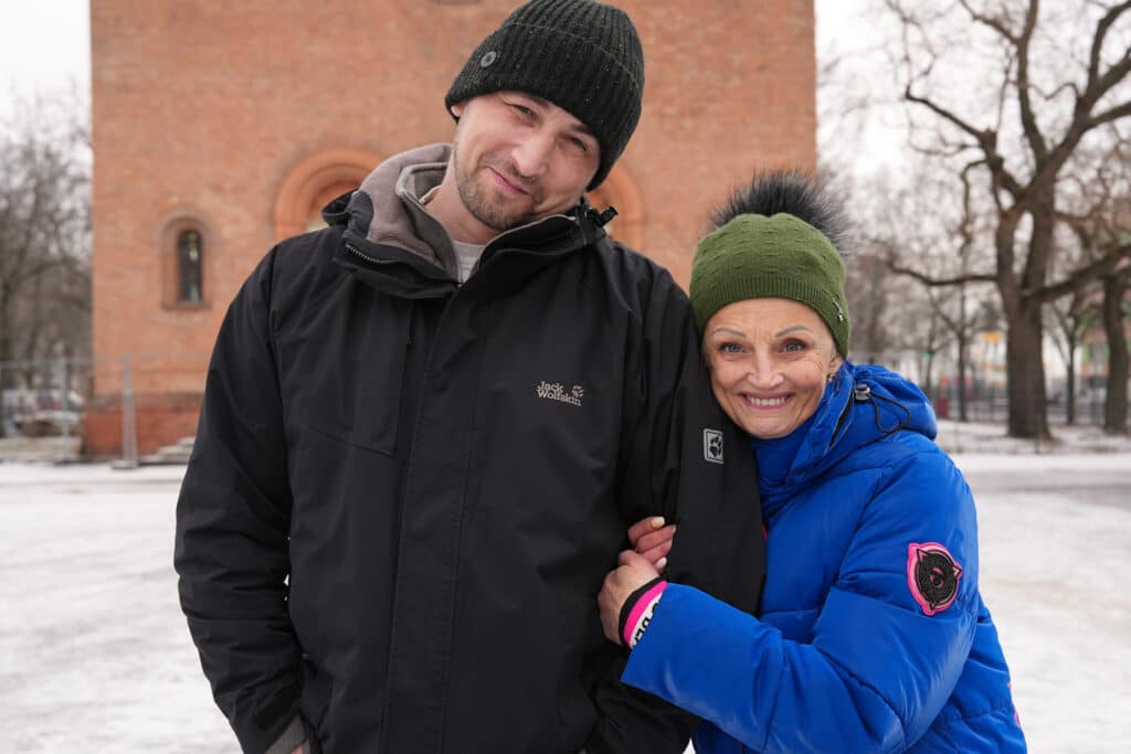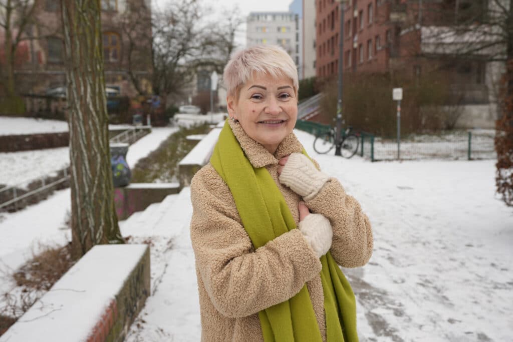 On a cold morning in Berlin's Leopoldplatz, a woman in a bright blue coat stands out against the grey winter sky. Leaning on her walker, she warms her hands around a cup of tea as she waits for her counsellor from PlusUkrDe e.V.